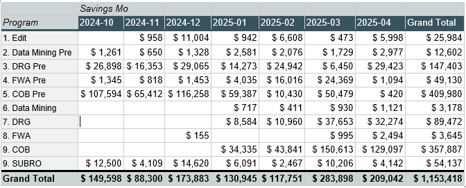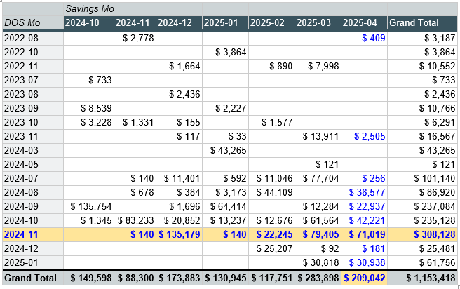 In our fictional data above, as of April 2025, the savings for claims with a DOS in November 2024 are $308,128. There were recorded savings across six months; this data is not static. Each time the data is refreshed, additional results may be added. As of April 2025, savings of $209,042 would be reported. This view demonstrates savings for claims with seven different DOS months.