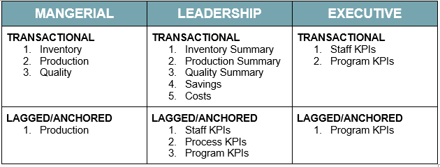 Whether you are using spreadsheets or reports/dashboards built in a business intelligence (BI) tool, an essential step in creating a reporting strategy is to differentiate the output by purpose and audience. Your executive team does not need the same data or level of detail as your leaders, who may not need the same ability to drill down as your supervisors/managers. The chart below describes three reporting levels–managerial, leadership, and executive–and two views (transactional and lagged). Each provides a different perspective on performance.