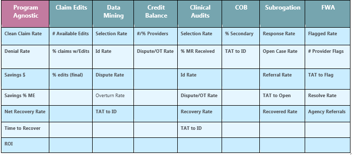 • Production metrics include counts, turnaround time (TAT), dollars, and percentages. They capture counts, TAT, percentage results, and dollars for a specific period (daily, weekly, monthly, etc.). These outcome or result metrics can be applied to each key process within a program (Selection, Records, Review, Letters, Dispute, Recovery (avoidance for prepay).